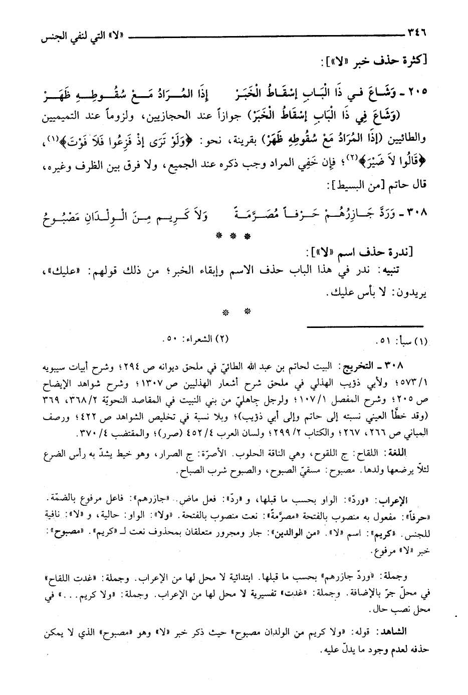 "وشاع في ذا الباب إسقاط الخبر" جوازا عند الحجازيين، ولزوما عند التميميين والطائيين "إذا المراد مع سقوطه ظهر" بقرينة، نحو: {وَلَوْ تَرَى إِذْ فَزِعُوا فَلا فَوْتَ} 1، {قَالُوا لَا ضَيْرَ} 2؛ فإن خفي المراد وجب ذكره عند الجميع، ولا فرق بين الظرف وغيره، قال حاتم "من البسيط":