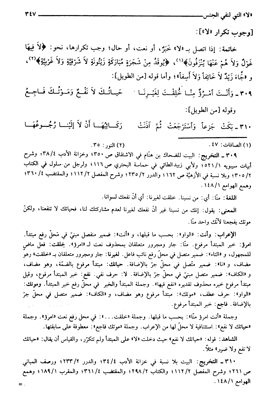 خاتمة: إذا اتصل بـ"لا" خبر، أو نعت، أو حال؛ وجب تكرارها، نحو: {لا فِيهَا غَوْلٌ وَلا هُمْ عَنْهَا يُنْزَفُونَ} 1، {يُوقَدُ مِنْ شَجَرَةٍ مُبَارَكَةٍ زَيْتُونَةٍ لا شَرْقِيَّةٍ وَلا غَرْبِيَّةٍ} 2، و"جاء زيد لا خائفا ولا أسفا"؛ وأما قوله "من الطويل":