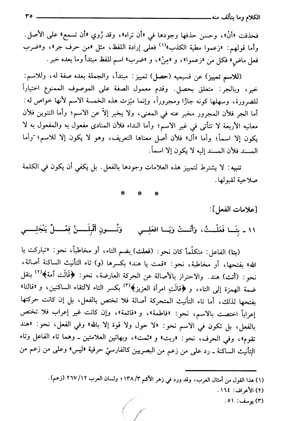 "بِتَا" الفاعل: متكلما كان نحو: "فَعَلْت" بضم التاء، أو مخاطبا، نحو: "تباركت يا الله" بفتحها، أو مخاطبة، نحو: "قمت يا هند" بكسرها "وَ" تاء التأنيث الساكنة أصالة، نحو: "أَتَتْ" هند. والاحتراز بالأصالة عن الحركة العارضة، نحو: {قَالَتْ أُمَّةٌ} 2 بنقل ضمة الهمزة إلى التاء، و {قَالَتِ امْرَأَتُ الْعَزِيزِ} 3 بكسر التاء لالتقاء الساكنين، و"قالتا" بفتحها لذلك، أما تاء التأنيث المتحركة أصالة فلا تختص بالفعل، بل إن كانت حركتها إعرابا اختصت بالاسم، نحو: "فاطمة" و"قائمة"، وإن كانت غير إعراب فلا تختص بالفعل، بل تكون في الاسم نحو: "لا حول ولا قوة إلا بالله" وفي الفعل، نحو: "هند تقوم"، وفي الحرف، نحو: "ربت" و"ثمت"، وبهاتين العلامتين -وهما تاء الفاعل وتاء التأنيث الساكنة- رد على من زعم من البصريين كالفارسي حرفية "ليس" وعلى من زعم من