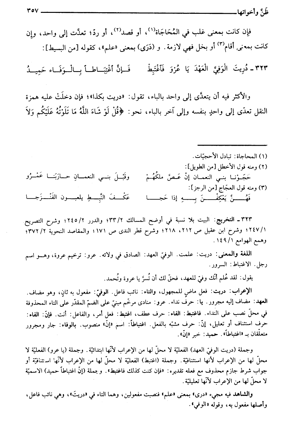 فإذا كانت بمعنى غلب في المحاجاة1، أو قصد2، أو رد؛ تعدت إلى واحد، وإن كانت بمعنى أقام3 أو بخل فهي لازمة. و"درى" بمعنى "علم"، كقوله "من البسيط":