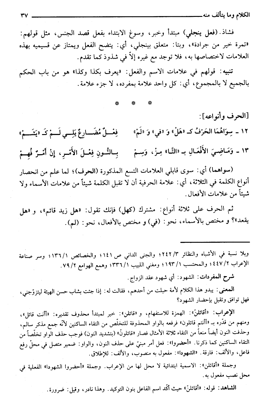 ثم الحرف على ثلاثة أنواع: مشترك "كَهَلْ" فإنك تقول: "هل زيد قائم"؛ و"هل يقعد"؟ ومختص بالأسماء، نحو: "فِي" ومختص بالأفعال، نحو: "لم".