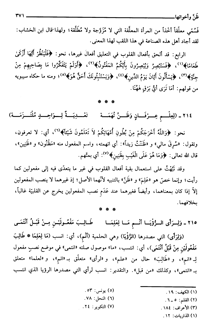 الرابع: قد ألحق بأفعال القلوب في التعليق أفعال غيرها، نحو: {فَلْيَنْظُرْ أَيُّهَا أَزْكَى طَعَامًا} 1، {فَسَتُبْصِرُ وَيُبْصِرُونَ، بِأَيِّكُمُ الْمَفْتُونُ} 2، {أَوَلَمْ يَتَفَكَّرُوا مَا بِصَاحِبِهِمْ مِنْ جِنَّةٍ} 3، {يَسْأَلونَ أَيَّانَ يَوْمُ الدِّينِ} 4، {وَيَسْتَنْبِئُونَكَ أَحَقٌّ هُوَ} 5؛ ومنه ما حكاه سيبويه من قولهم: أما ترى أي برق ههنا.