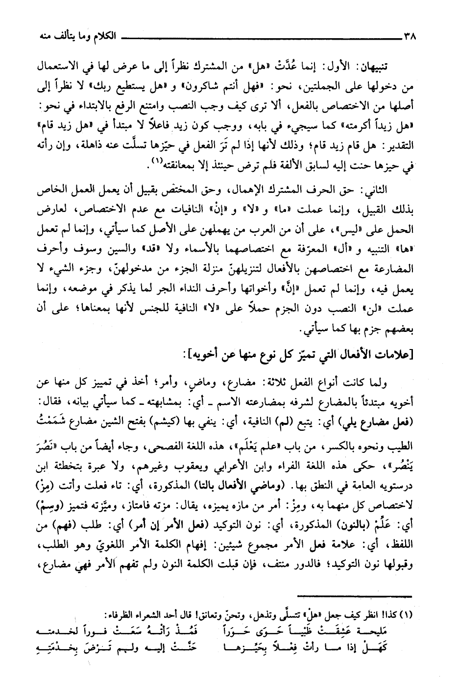 تنبيهان: الأول: إنما عدت "هل" من المشترك نظرا إلى ما عرض لها في الاستعمال من دخولها على الجملتين، نحو: "فهل أنتم شاكرون" و "هل يستطيع ربك" لا نظرا إلى أصلها من الاختصاص بالفعل، ألا ترى كيف وجب النصب وامتنع الرفع بالابتداء في نحو: "هل زيد أكرمته" كما سيجيء في بابه، ووجب كون زيد فاعلا لا مبتدأ في "هل زيد قام" التقدير: هل قام زيد قام؛ وذلك لأنها إذا لم تر الفعل في حيزها تسلَّت عنها ذاهلة، وإن رأته في حيزها حنت إليه لسابق الألفة فلم ترض حينئذٍ إلا بمعانقته1.