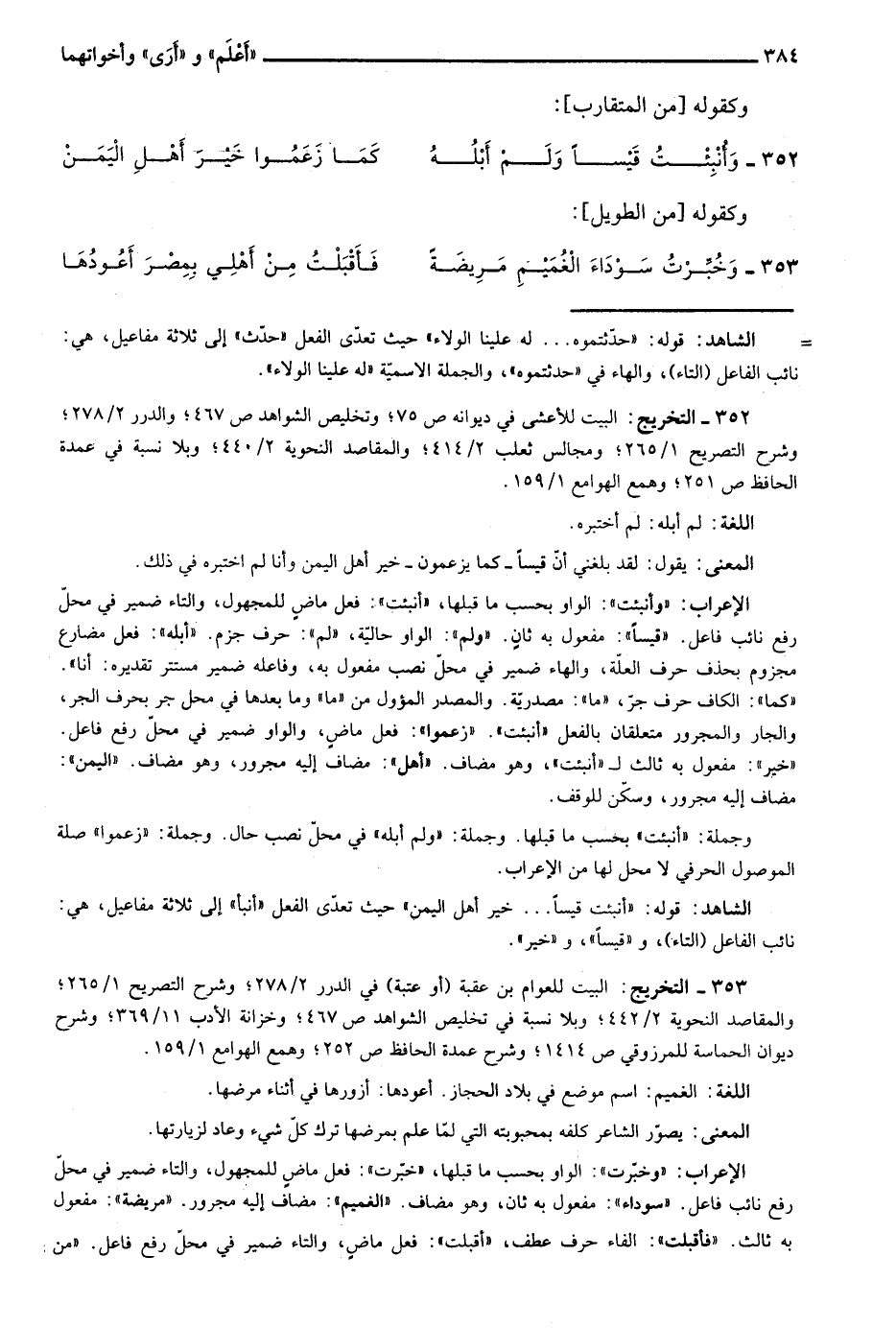 353- التخريج: البيت للعوام بن عقبة "أو عتبة" في الدرر 2/ 278؛ وشرح التصريح 1/ 265؛ والمقاصد النحوية 2/ 442؛ وبلا نسبة في تخليص الشواهد ص467؛ وخزانة الأدب 11/ 269؛ وشرح ديوان الحماسة للمرزوقي ص1414؛ وشرح عمدة الحافظ ص252؛ وهمع الهوامع 1/ 159.