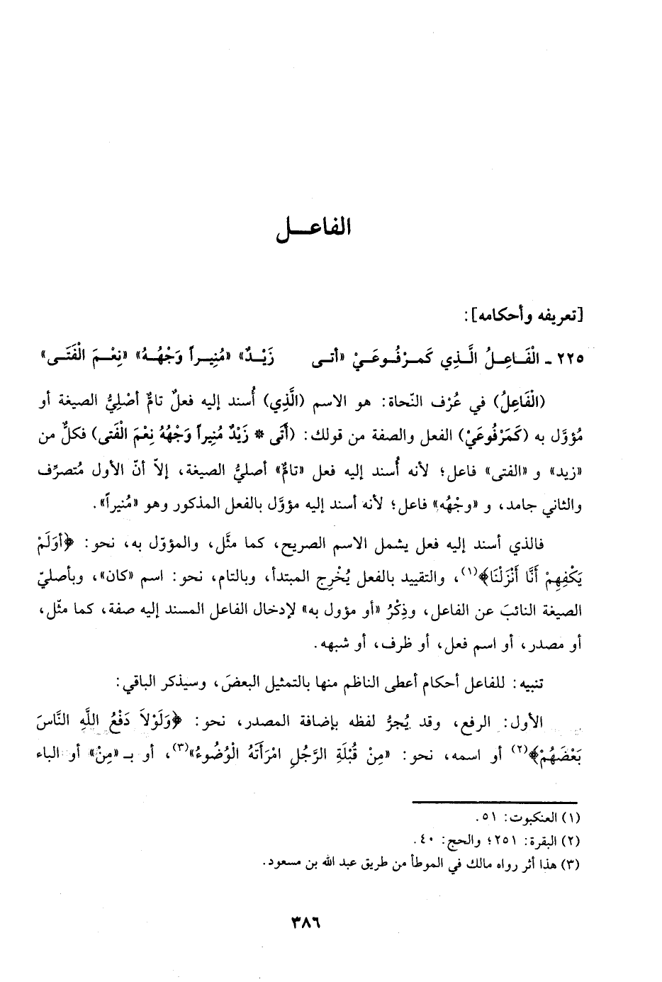 "الفاعل" في عرف النحاة: هو الاسم "الذي" أسند إليه فعل تام أصلي الصيغة أو مؤول به "كمرفوعي" الفعل والصفة من قولك: "أتى زيد منيرا وجهه نعم الفتى" فكل من "زيد" و"الفتى" فاعل؛ لأنه أسند إليه فعل "تام" أصلي الصيغة، إلا أن الأول متصرف والثاني جامد، و"وجهه" فاعل؛ لأنه أسند إليه مؤول بالفعل المذكور وهو "منيرا".