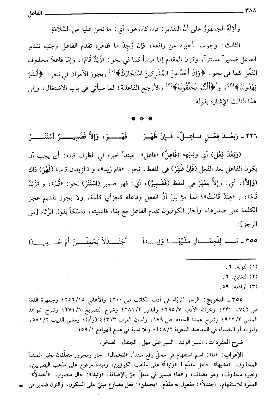 الثالث: وجوب تأخيره عن رافعه، فإن وجد ما ظاهره تقدم الفاعل وجب تقدير الفاعل ضميرا مستترا، وكون المقدم إما مبتدأ كما في نحو: "زيد قام"، وإما فاعلا محذوف الفعل كما في نحو: {وَإِنْ أَحَدٌ مِنَ الْمُشْرِكِينَ اسْتَجَارَكَ} 1 ويجوز الأمران في نحو: {أَبَشَرٌ يَهْدُونَنَا} 2، {أَأَنْتُمْ تَخْلُقُونَهُ} 3 والأرجح الفاعلية؛ لما سيأتي في باب الاشتغال، وإلى هذا الثالث الإشارة بقوله: