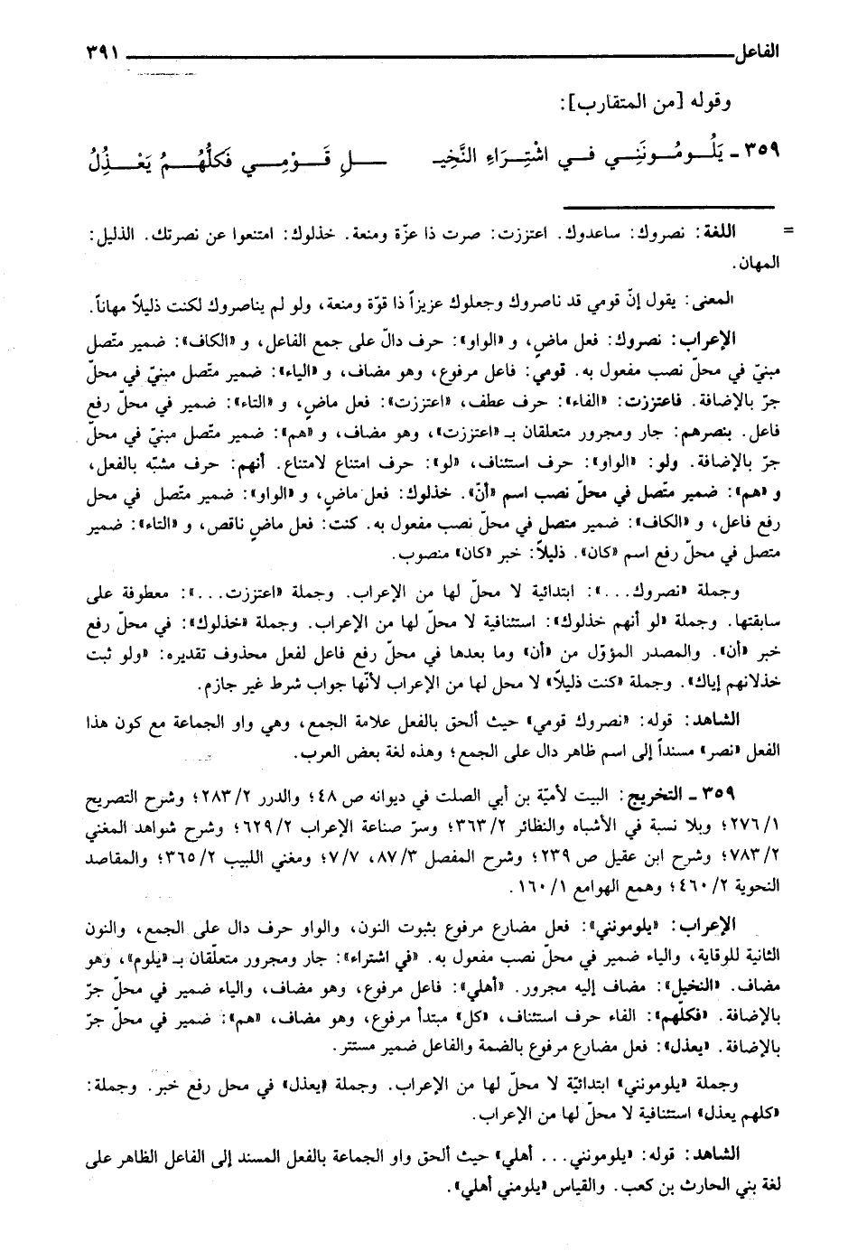 الشاهد: قوله: "يلومونني ... أهلي" حيث ألحق واو الجماعة بالفعل المسند إلى الفاعل الظاهر على لغة بني الحارث بن كعب. والقياس "يلومني أهلي".
