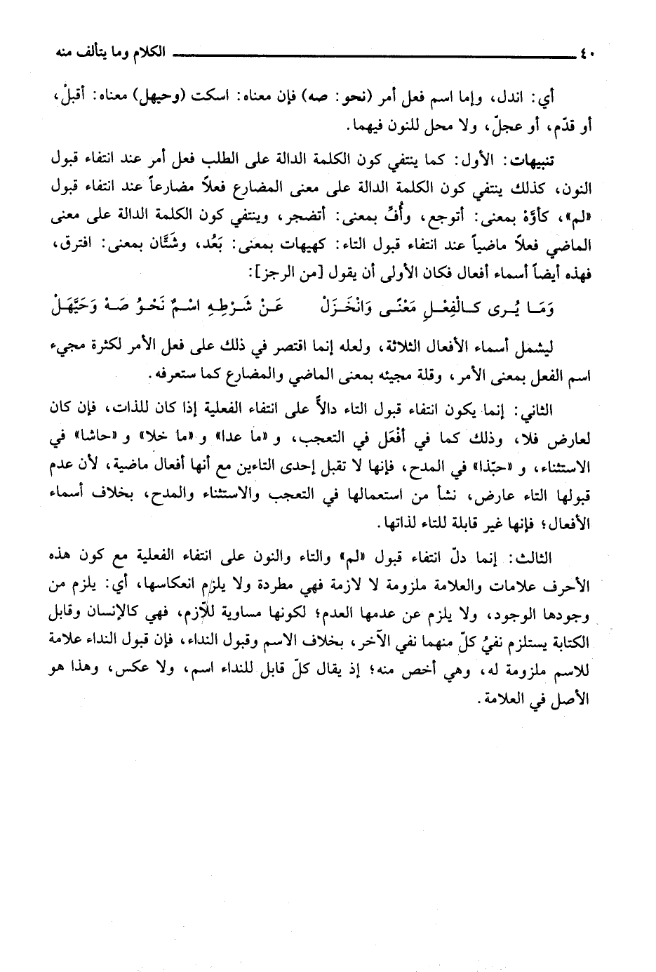 تنبيهات: الأول: كما ينتفي كون الكلمة الدالة على الطلب فعل أمر عند انتفاء قبول النون، كذلك ينتفي كون الكلمة الدالة على معنى المضارع فعلا مضارعا عند انتفاء قبول "لم"، كأوّه بمعنى: أتوجع، وأف بمعنى: أتضجر، وينتفي كون الكلمة الدالة على معنى الماضي فعلا ماضيا عند انتفاء قبول التاء: كهيهات بمعنى: بعد، وشتان بمعنى: افترق، فهذه أيضا أسماء أفعال فكان الأولى أن يقول "من الرجز":