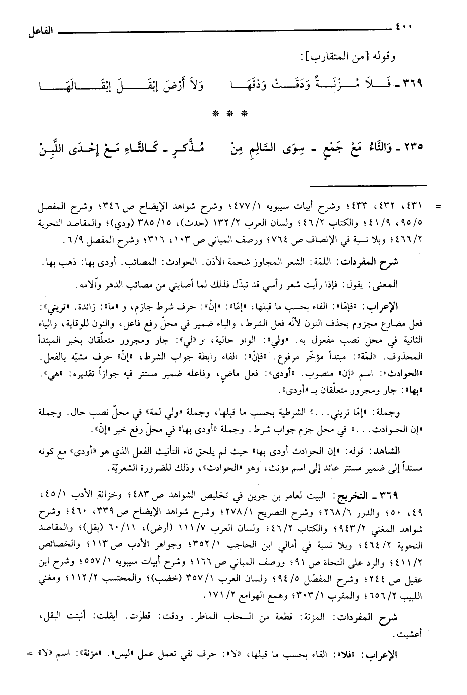 الشاهد: قوله: "إن الحوادث أودى بها" حيث لم يلحق تاء التأنيث الفعل الذي هو "أودى" مع كونه مسندا إلى ضمير مستتر عائد إلى اسم مؤنث، وهو "الحوادث"، وذلك للضرورة الشعرية.