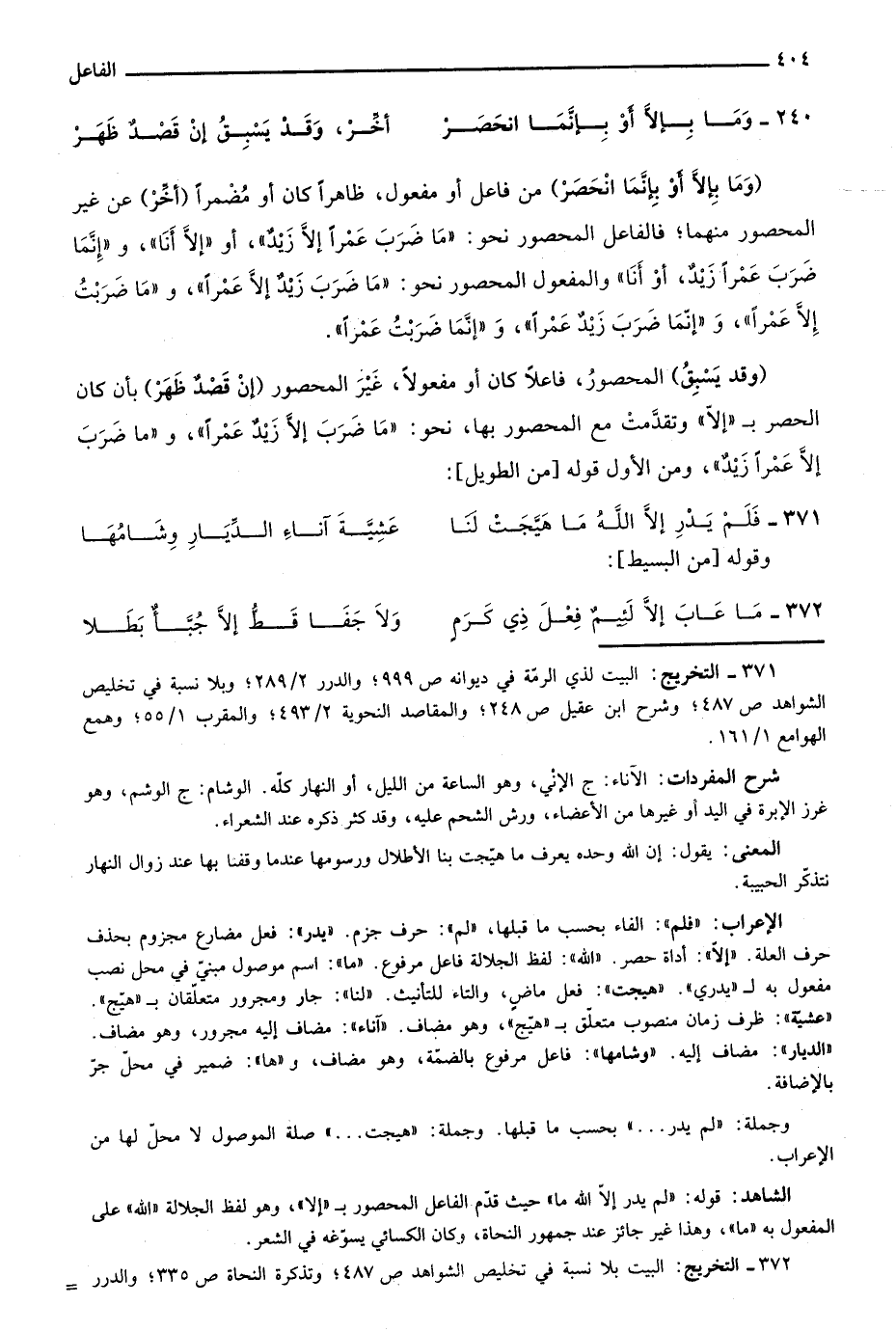 371- التخريج: البيت لذي الرمة في ديوانه ص999؛ والدرر 2/ 289؛ وبلا نسبة في تخليص الشواهد ص487؛ وشرح ابن عقيل ص248؛ والمقاصد النحوية 2/ 493؛ والمقرب 1/ 55؛ وهمع الهوامع 1/ 161.