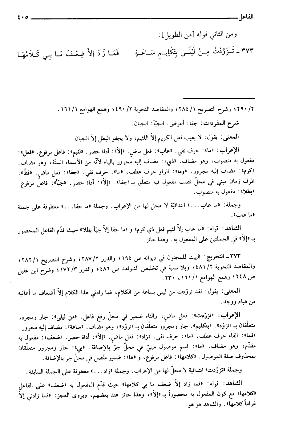 373- التخريج: البيت للمجنون في ديوانه ص194؛ والدرر 2/ 287؛ وشرح التصريح 1/ 282؛ والمقاصد النحوية 2/ 481؛ وبلا نسبة في تخليص الشواهد ص486؛ والدرر 3/ 172؛ وشرح ابن عقيل ص248؛ وهمع الهوامع 1/ 161، 230.