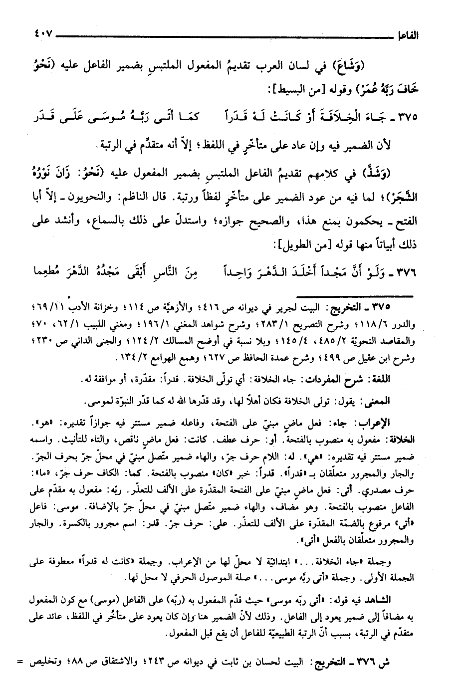 "وشاع" في لسان العرب تقديم المفعول الملتبس بضمير الفاعل عليه "نحو خاف ربه عمر" وقوله "من البسيط":