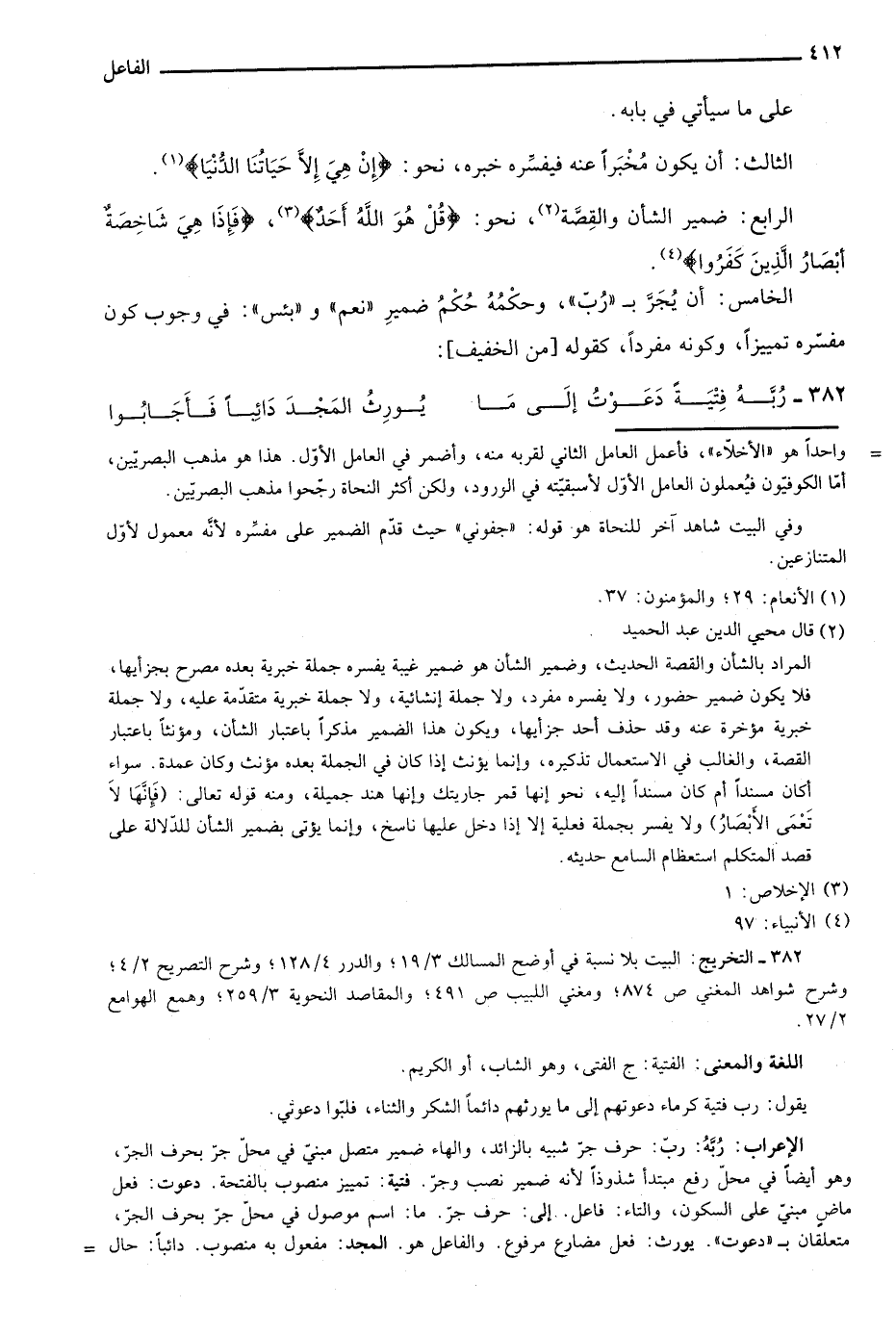 الإعراب: ربه: رب: حرف جر شبيه بالزائد، والهاء ضمير متصل مبني في محل جر بحرف الجر، وهو أيضا في محل رفع مبتدأ شذوذا لأنه ضمير نصب وجر. فتية: تمييز منصوب بالفتحة. دعوت: فعل ماض مبني على السكون، والتاء: فاعل. إلى: حرف جر. ما: اسم موصول في محل جر بحرف الجر، متعلقان بـ"دعوت". يورث: فعل مضارع مرفوع. والفاعل هو. المجد: مفعول به منصوب. دائبا: حال =