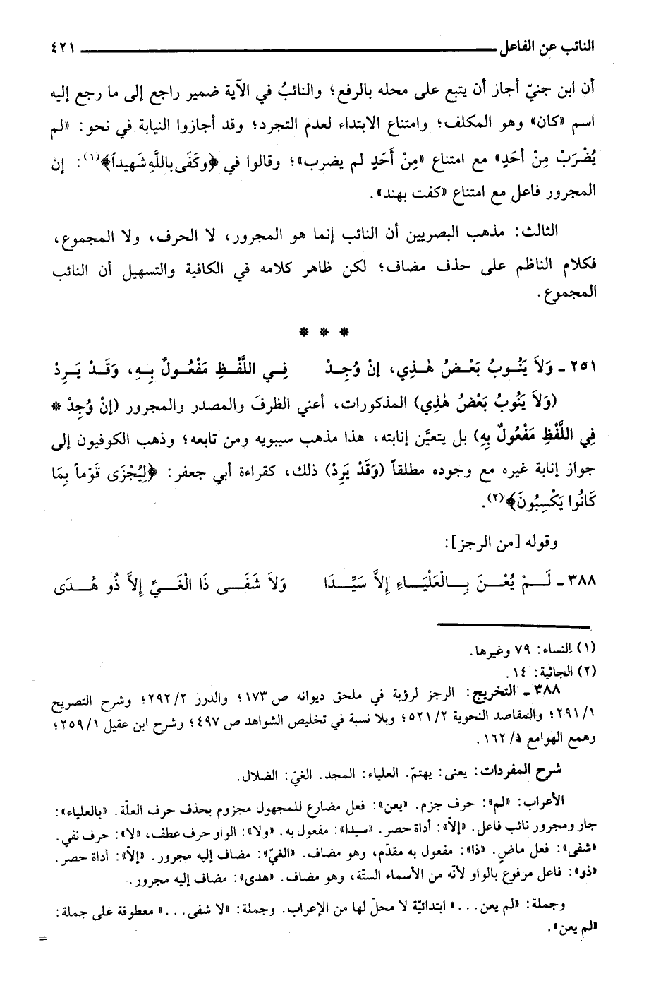 الثالث: مذهب البصريين أن النائب إنما هو المجرور، لا الحرف، ولا المجموع، فكلام الناظم على حذف المضاف؛ لكن ظاهر كلامه في الكافية والتسهيل أن النائب المجموع.