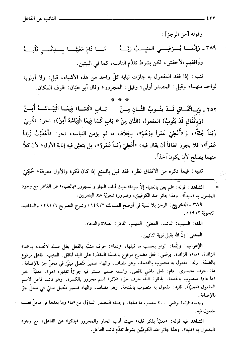 389- التخريج: الرجز بلا نسبة في أوضح المسالك 2/ 149؛ وشرح التصريح 1/ 291؛ والمقاصد النحوية 2/ 519.