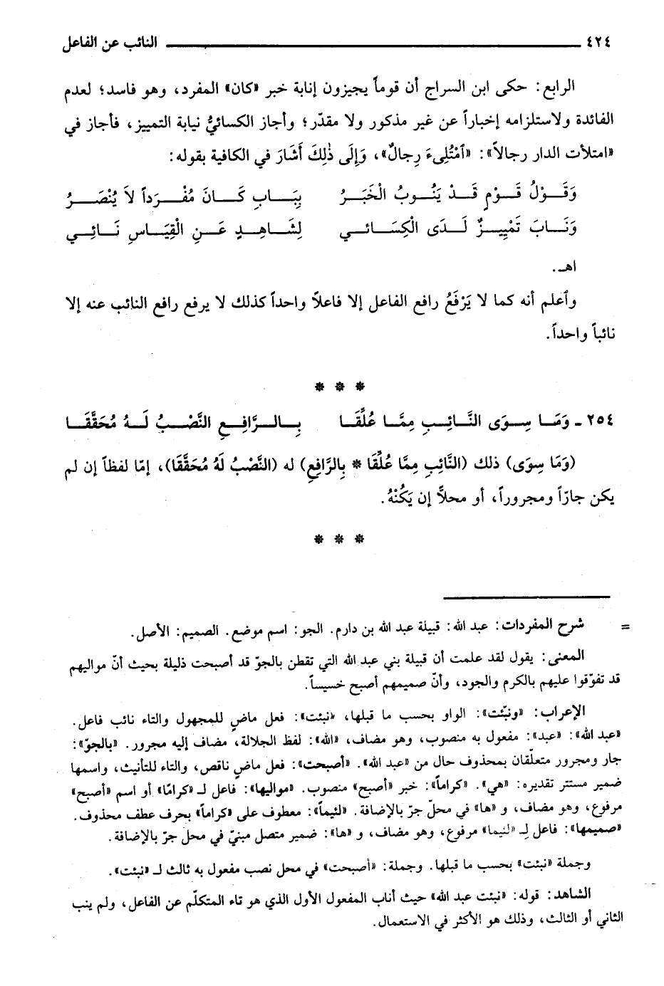 الشاهد: قوله: "نبئت عبد الله" حيث أناب المفعول الأول الذي هو تاء المتكلم عن الفاعل، ولم ينب الثاني أو الثالث، وذلك هو الأكثر في الاستعمال.