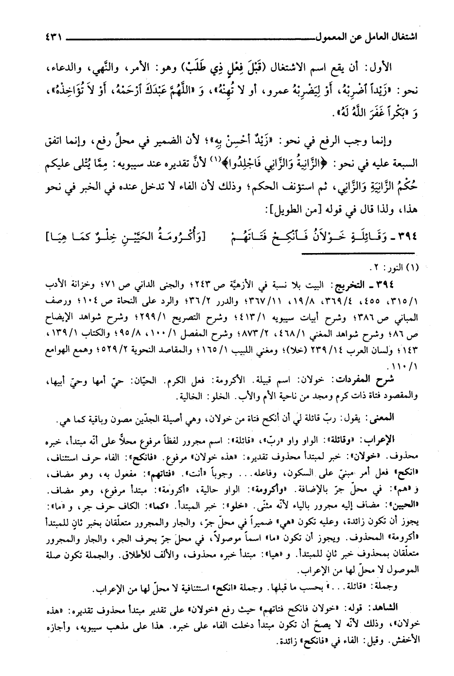 الشاهد: قوله: "خولان فانكح فتاتهم" حيث رفع "خولان" على تقدير مبتدأ محذوف تقديره: "هذه خولان"، وذلك لأنه لا يصح أن تكون مبتدأ دخلت الفاء على خبره. هذا على مذهب سيبويه، وأجازه الأخفش. وقيل: الفاء في "فانكح" زائدة.