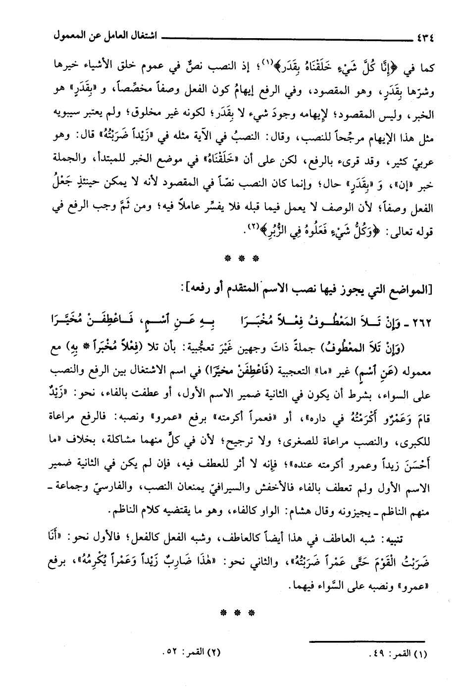 كما في {إِنَّا كُلَّ شَيْءٍ خَلَقْنَاهُ بِقَدَرٍ} 1؛ إذ النصب نص في عموم خلق الأشياء خيرها وشرها بقدر، وهو المقصود، وفي الرفع إيهام كون الفعل وصفا مخصصا، و"بقدر" هو الخبر، وليس المقصود؛ لإيهامه وجود شيء لا بقدر؛ لكونه غير مخلوق؛ ولم يعتبر سيبويه مثل هذا الإيهام مرجحا للنصب، وقال: النصب في الآية مثله في "زيدا ضربته" قال: وهو عربي كثير، وقد قرئ بالرفع، لكن على أن "خلقناه" في موضع الخبر للمبتدأ، والجملة خبر "إن"، و"بقدر" حال؛ وإنما كان النصب نصا في المقصود لأنه لا يمكن حينئذ جعل الفعل وصفا؛ لأن الوصف لا يعمل فيما قبله فلا يفسر عاملا فيه؛ ومن ثم وجب الرفع في قوله تعالى: {وَكُلُّ شَيْءٍ فَعَلُوهُ فِي الزُّبُرِ} 2.