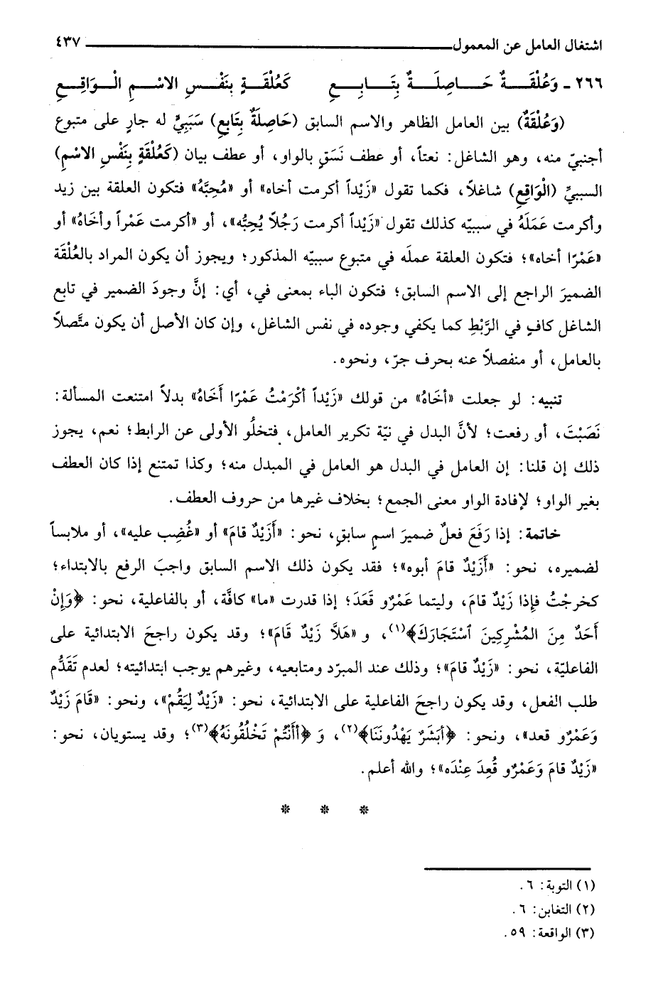 خاتمة: إذا رفع فعل ضمير اسم سابق، نحو: "أزيد قام" أو "غضب عليه"، أو ملابسا لضميره، نحو: "أزيد قام أبوه"؛ فقد يكون ذلك الاسم السابق واجب الرفع بالابتداء؛ كخرجت فإذا زيد قام، وليتما عمرو قعد؛ إذا قدرت "ما" كافة، أو بالفاعلية، نحو: {وَإِنْ أَحَدٌ مِنَ الْمُشْرِكِينَ اسْتَجَارَكَ} 1، و"هلا زيد قام"؛ وقد يكون راجح الابتدائية على الفاعلية، نحو: "زيد قام"؛ وذلك عند المبرد ومتابعيه، وغيرهم يوجب ابتدائيته؛ لعدم تقدم طلب الفعل، وقد يكون راجح الفاعلية على الابتدائية، نحو: "زيد ليقم"، ونحو: "قام زيد وعمرو قعد"، ونحو: {أَبَشَرٌ يَهْدُونَنَا} 2، و {أَأَنْتُمْ تَخْلُقُونَهُ} 3؛ وقد يستويان، نحو: "زيد قام وعمرو قعد عنده"؛ والله أعلم.