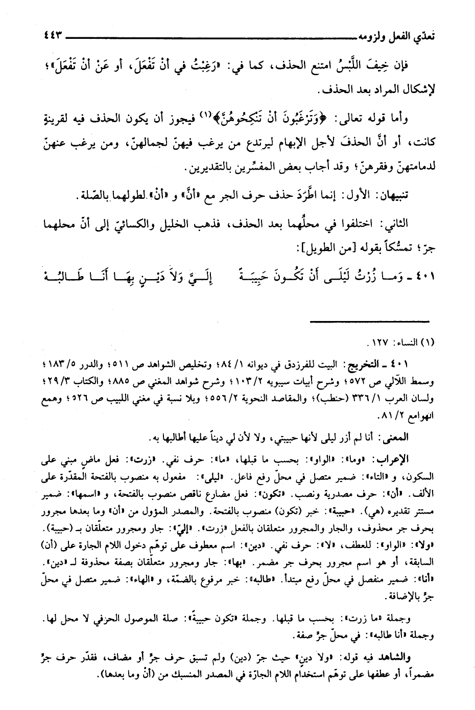 وأما قوله تعالى: {وَتَرْغَبُونَ أَنْ تَنْكِحُوهُنَّ} 1 فيجوز أن يكون الحذف فيه لقرينة كانت، أو أن الحذف لأجل الإبهام ليرتدع من يرغب فيهن لجمالهن، ومن يرغب عنهم لدمامتهن وفقرهن؛ وقد أجاب بعض المفسرين بالتقديرين.