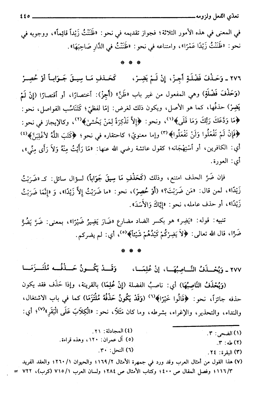 "وحذف فضلة" وهي المفعول من غير باب "ظن" "أجز": اختصارا، أو اقتصارا "إن لم يضر" حذفها، كما هو الأصل، ويكون ذلك لغرض: إما لفظي؛ كتناسب الفواصل، نحو: {مَا وَدَّعَكَ رَبُّكَ وَمَا قَلَى} 1، ونحو: {إِلَّا تَذْكِرَةً لِمَنْ يَخْشَى} 2، وكالإيجاز في نحو: {فَإِنْ لَمْ تَفْعَلُوا وَلَنْ تَفْعَلُوا} 3 وإما معنوي؛ كاحتقاره في نحو؛ {كَتَبَ اللَّهُ لَأَغْلِبَنَّ} 4 أي: الكافرين، أو استهجانه؛ كقول عائشة رضي الله عنها: "ما رأيت منه ولا رأى مني"، أي: العورة.