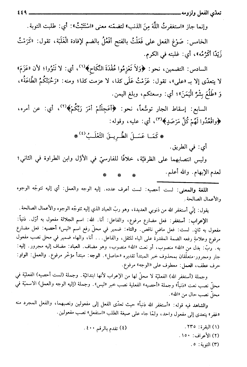 الإعراب: أستغفر: فعل مضارع مرفوع، والفاعل: أنا. الله: اسم الجلالة مفعول به أول. ذنبا: مفعول به ثان. لست: فعل ماض ناقص. والتاء: ضمير في محل رفع اسم "ليس" أحصيه: فعل مضارع مرفوع وعلامة رفعه الضمة المقدرة على الياء للثقل، والفاعل ... أنا، والهاء ضمير في محل نصب مفعول به. رب: بدل من "الله" منصوب، أو نعت "الله" منصوب، وهو مضاف. العباد: مضاف إليه مجرور. إليه: جار ومجرور متعلقان بمحذوف خبر المبتدأ تقديره "حاصل". الوجه: مبتدأ مؤخر مرفوع. والعمل: الواو: حرف عطف، العمل: معطوف على "الوجه" مرفوع.