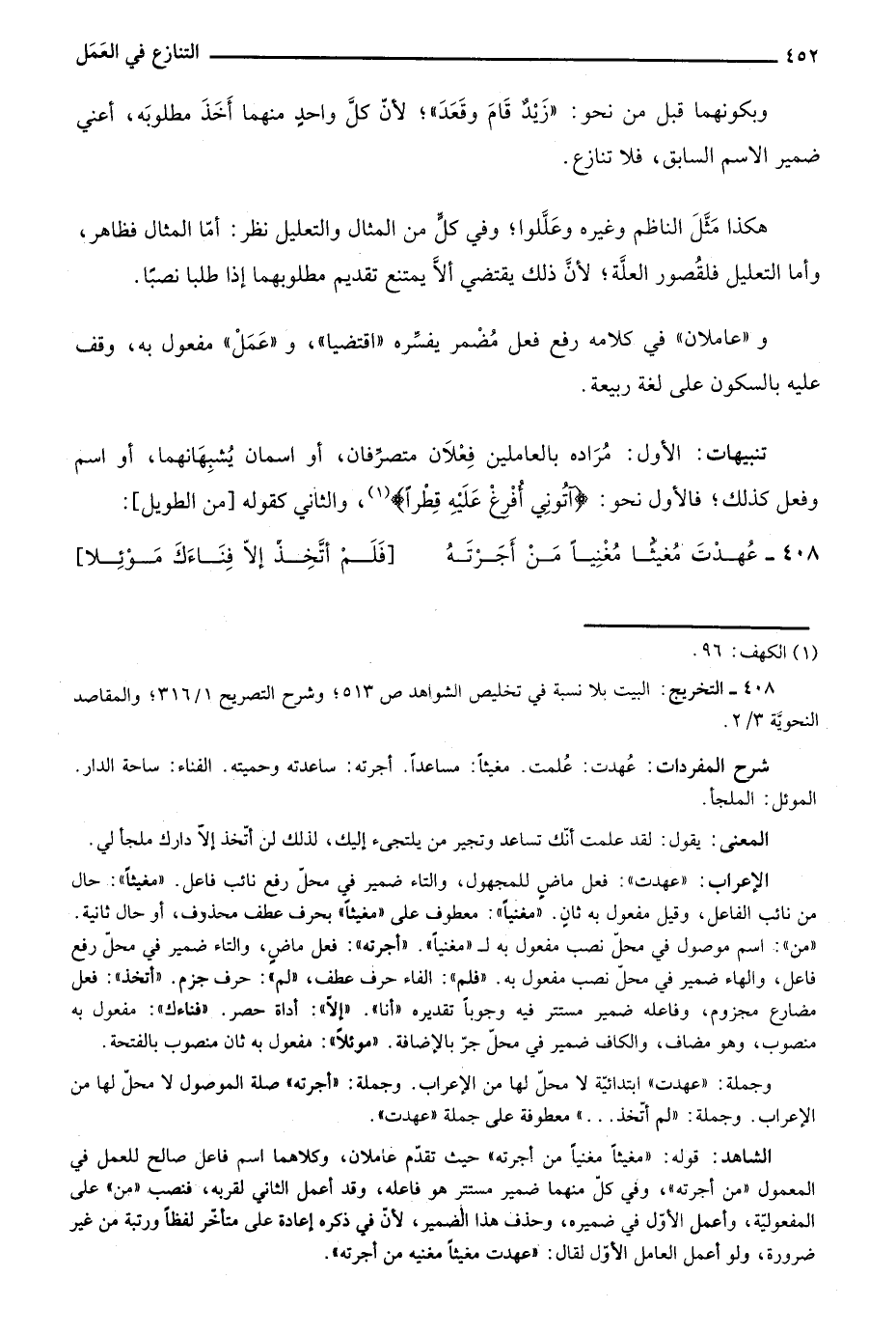 الشاهد: قوله: "مغيثا مغنيا من أجرته" حيث تقدم عاملان، وكلاهما اسم فاعل صالح للعمل في المعمول "من أجرته"، وفي كل منهما ضمير مستتر هو فاعله، وقد أعمل الثاني لقربه، فنصب "من" على المفعولية، وأعمل الأول في ضميره، وحذف هذا الضمير، لأن في ذكره إعادة على متأخر لفظا ورتبة من غير ضرورة، ولو أعمل العامل الأول لقال: "عهدت مغيثا مغنيه من أجرته".