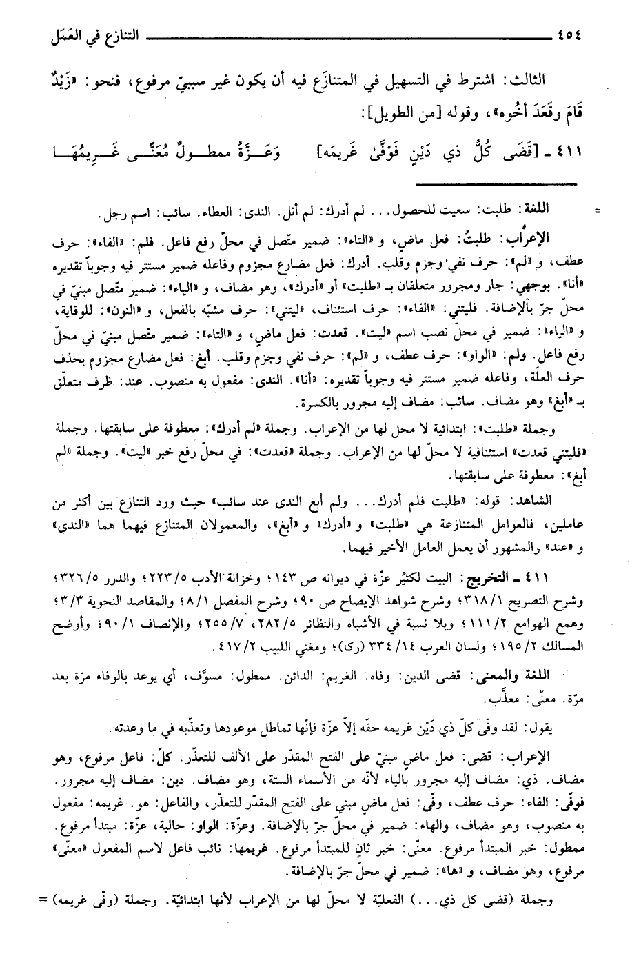 الإعراب: قضى: فعل ماض مبني على الفتح المقدر على الألف للتعذر. كل: فاعل مرفوع، وهو مضاف. ذي: مضاف إليه مجرور بالياء لأنه من الأسماء الستة، وهو مضاف. دين: مضاف إليه مجرور. فوفى: الفاء: حرف عطف، وفى: فعل ماض مبني على الفتح المقدر للتعذر، والفاعل: هو. غريمه: مفعول به منصوب، وهو مضاف، والهاء: ضمير في محل جر بالإضافة. وعزة: الواو: حالية، عزة: مبتدأ مرفوع. ممطول: خبر المبتدأ مرفوع. معنى: خبر ثان للمبتدأ مرفوع. غريمها: نائب فاعل لاسم المفعول "معنى" مرفوع، وهو مضاف، و"ها": ضمير في محل جر بالإضافة.