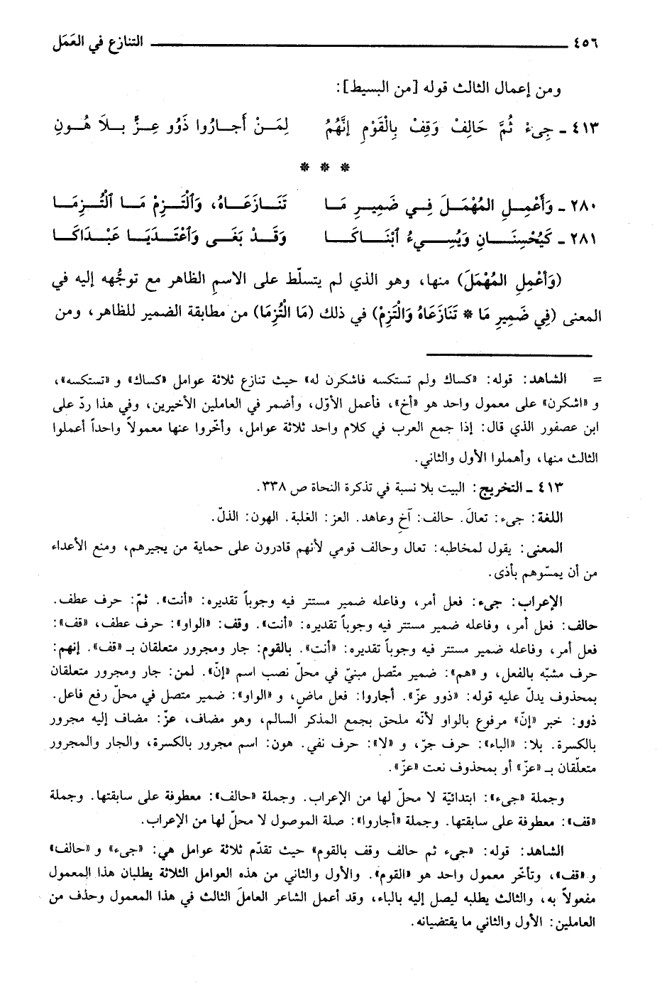 الشاهد: قوله: "جئ ثم حالف وقف بالقوم" حيث تقدم ثلاثة عوامل هي: "جئ" و"حالف" و"قف"، وتأخر معمول واحد هو "القوم". والأول والثاني من هذه العوامل الثلاثة يطلبان هذا المعمول مفعولا به، والثالث يطلبه ليصل إليه بالباء، وقد أعمل الشاعر العامل الثالث في هذا المعمول وحذف من العاملين: الأول والثاني ما يقتضيانه.