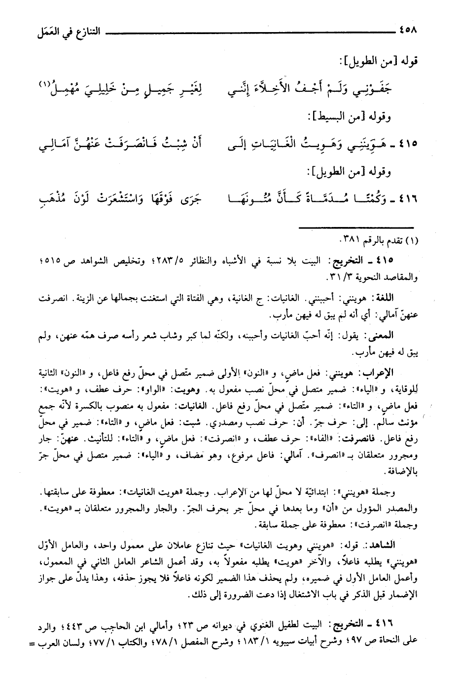 416- التخريج: البيت لطفيل الغنوي في ديوانه ص23؛ وأمالي ابن الحاجب ص443؛ والرد على النحاة ص97؛ وشرح أبيات سيبويه 1/ 183؛ وشرح المفصل 1/ 78؛ والكتاب 1/ 77؛ ولسان العرب =
