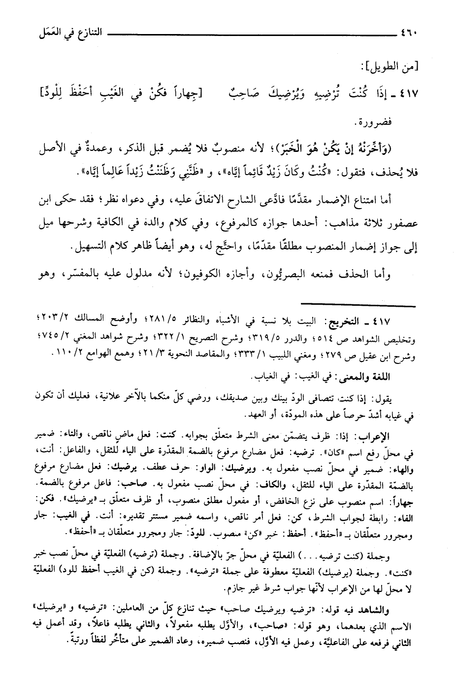 417- التخريج: البيت بلا نسبة في الأشباه والنظائر 5/ 218؛ وأوضح المسالك 2/ 203؛ وتخليص الشواهد ص514؛ والدرر 5/ 319؛ وشرح التصريح 1/ 322؛ وشرح شواهد المغني 2/ 745؛ وشرح ابن عقيل ص279؛ ومغني اللبيب 1/ 333؛ والمقاصد النحوية 3/ 21؛ وهمع الهوامع 2/ 110.