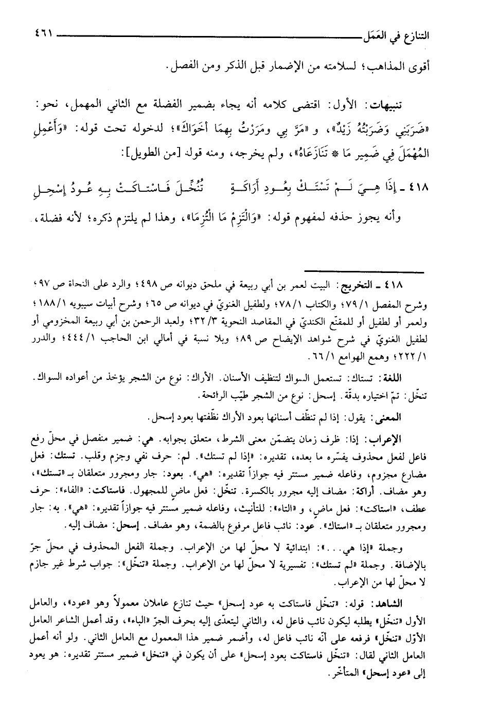 الشاهد: قوله: "تنخل فاستاكت به عود "إسحل" حيث تنازع عاملان معمولا وهو "عود"، والعامل الأول "تنخل" يطلبه ليكون نائب فاعل له، والثاني ليتعدى إليه بحرف الجر "الباء"، وقد أعمل الشاعر العامل الأول "تنخل" فرفعه على أنه نائب فاعل له، وأضمر ضمير هذا المعمول مع العامل الثاني. ولو أنه أعمل العامل الثاني لقال: "تنخل فاستاكت بعود إسحل" على أن يكون في "تنخل" ضمير مستتر تقديره: هو يعود إلى "عود إسحل" المتأخر.