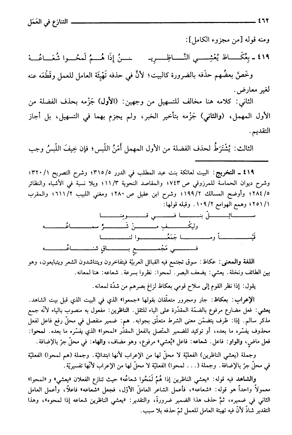 419- التخريج: البيت لعاتكة بنت عبد المطلب في الدرر 5/ 315؛ وشرح التصريح 1/ 320؛ وشرح ديوان الحماسة للمرزوقي ص743؛ والمقاصد النحوية 3/ 11؛ وبلا نسبة في الأشباه والنظائر 5/ 284؛ وأوضح المسالك 2/ 199؛ وشرح ابن عقيل ص280؛ ومغني اللبيب 2/ 611؛ والمقرب 1/ 251؛ وهمع الهوامع 2/ 109. وقبله قولها: