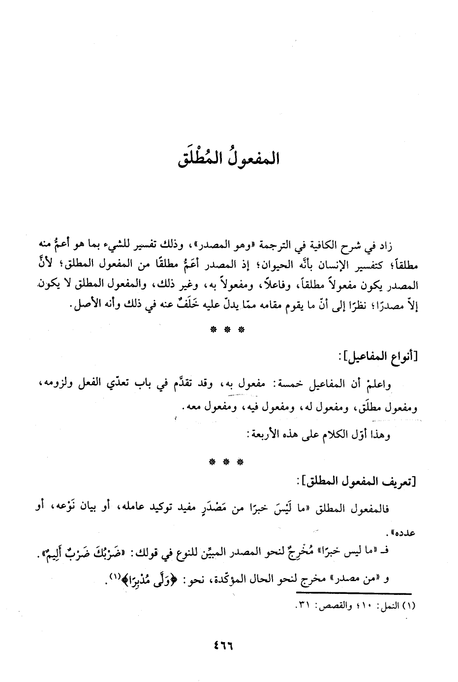 زاد في شرح الكافية في الترجمة "وهو المصدر"، وذلك تفسير للشيء بما هو أعم منه مطلقا؛ كتفسير الإنسان بأنه الحيوان؛ إذ المصدر أعم مطلقا من المفعول المطلق؛ لأن المصدر يكون مفعولا مطلقا، وفاعلا، ومفعولا به، وغير ذلك، والمفعول المطلق لا يكون إلا مصدرا؛ نظرا إلى أن ما يقوم مقامه مما يدل عليه خلف عنه في ذلك وأنه الأصل.