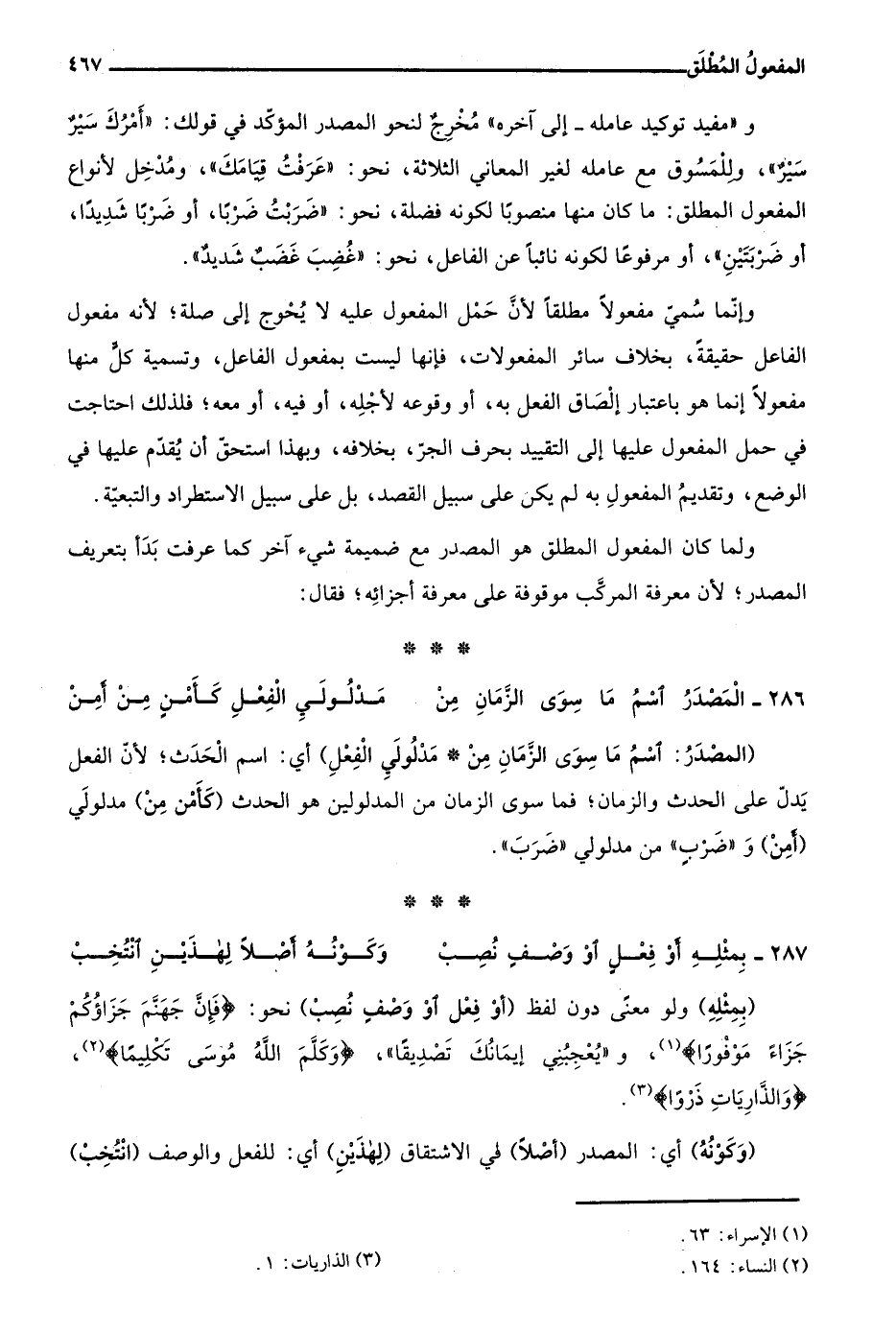 ولما كان المفعول المطلق هو المصدر مع ضميمة شيء آخر كما عرفت بدأ بتعريف المصدر؛ لأن معرفة المركب موقوفة على معرفة أجزائه؛ فقال: