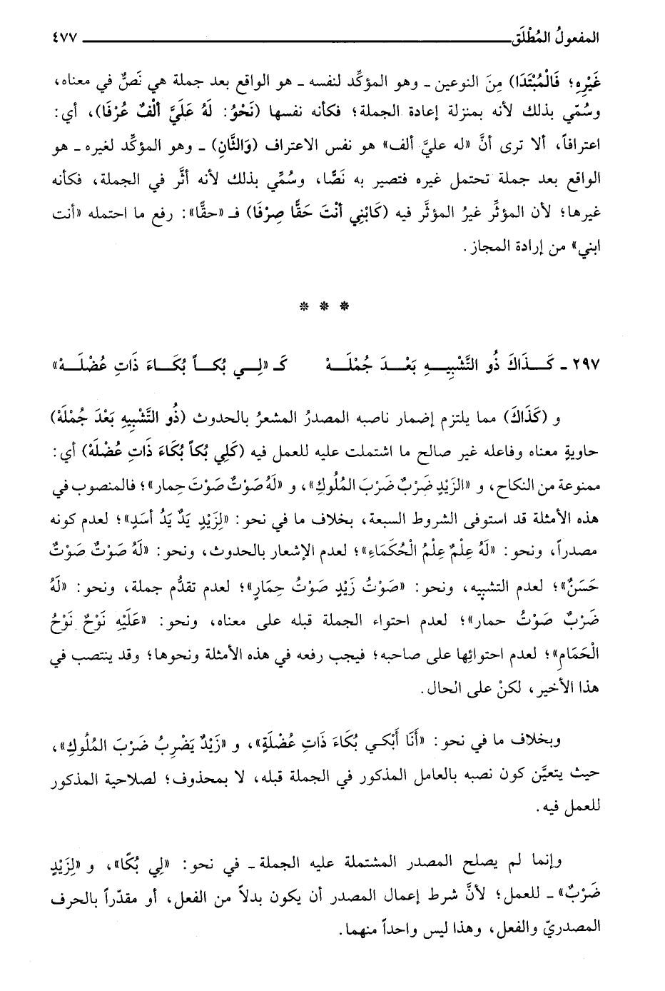 وبخلاف ما في نحو: "أنا أبكي بكاء ذات عضلة"، و"زيد يضرب ضرب الملوك"، حيث يتعين كون نصبه بالعامل المذكور في الجملة قبله، لا بمحذوف؛ لصلاحية المذكور للعمل فيه.