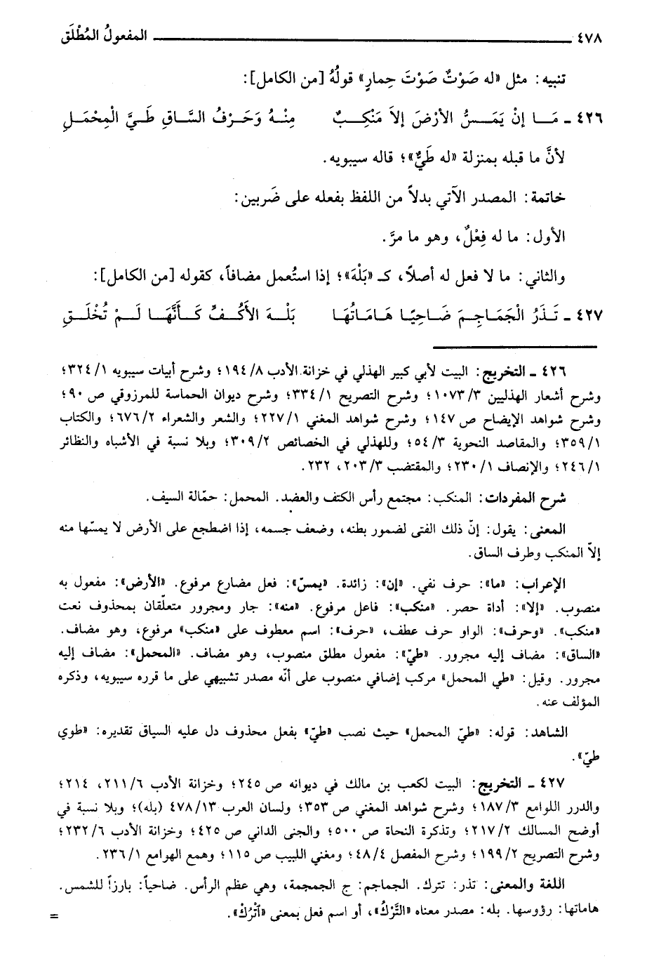 الإعراب: "ما": حرف نفي. "إن": زائدة. "يمس": فعل مضارع مرفوع. "الأرض": مفعول به منصوب. "إلا": أداة حصر. "منكب": فاعل مرفوع. "منه": جار ومجرور متعلقان بمحذوف نعت "منكب". "وحرف": الواو حرف عطف، "حرف": اسم معطوف على "منكب" مرفوع، وهو مضاف. "الساق": مضاف إليه مجرور. "طي": مفعول مطلق منصوب، وهو مضاف. "المحمل": مضاف إليه مجرور. وقيل: "طي المحمل" مركب إضافي منصوب على أنه مصدر تشبيهي على ما قرره سيبويه، وذكره المؤلف عنه.