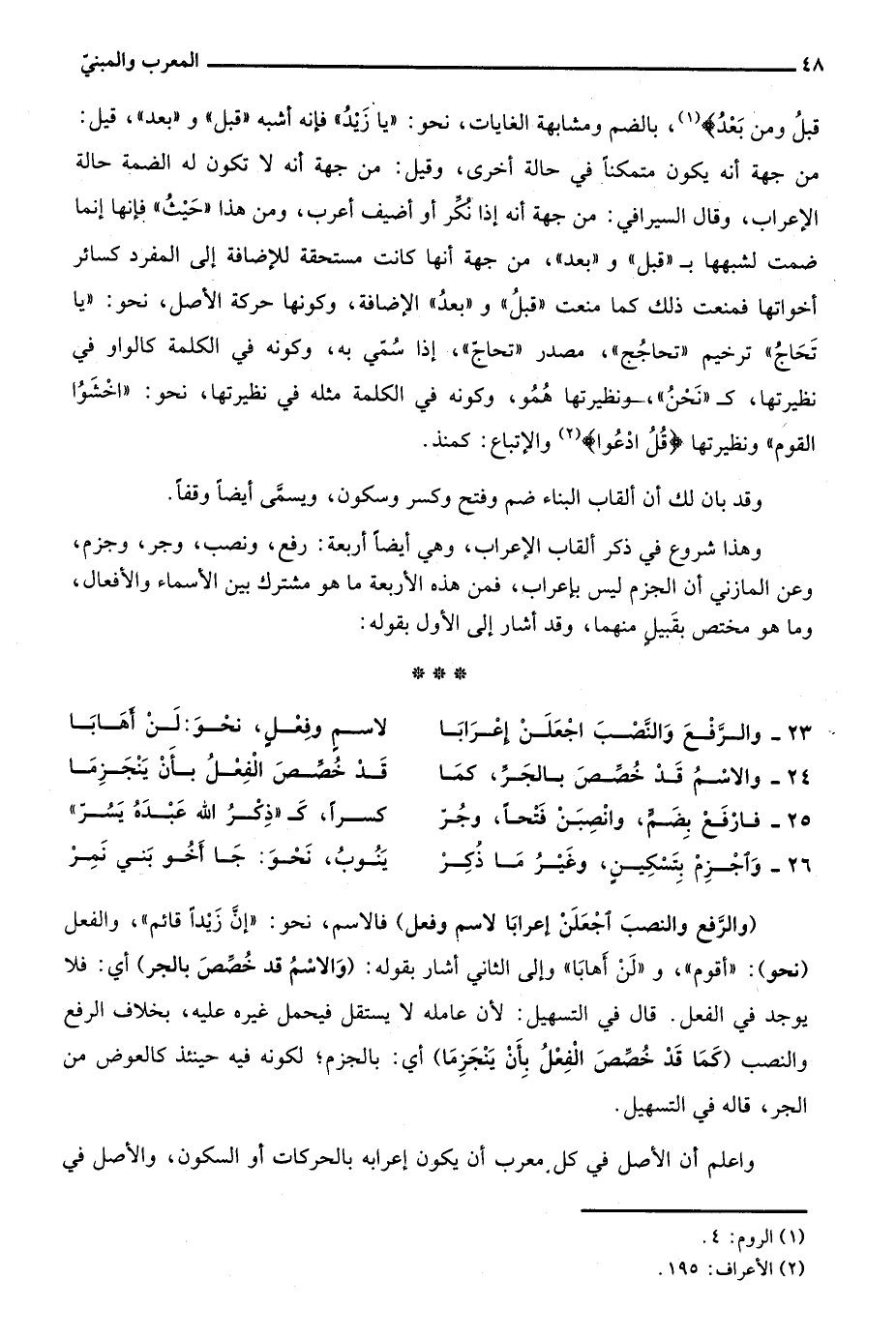 وهذا شروع في ذكر ألقاب الإعراب، وهي أيضا أربعة: رفع، ونصب، وجر، وجزم، وعن المازني أن الجزم ليس بإعراب، فمن هذه الأربعة ما هو مشترك بين الأسماء والأفعال، وما هو مختص بقبيل منهما، وقد أشار إلى الأول بقوله: