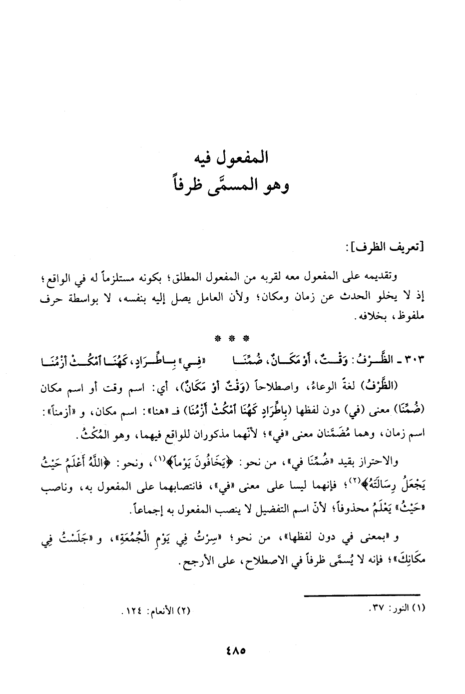 "الظرف" لغة الوعاء، واصطلاحا "وقت أو مكان"، أي: اسم وقت أو اسم مكان "ضمنا" معنى "في" دون لفظها "باطراد كهنا امكث أزمنا" فـ"هنا": اسم مكان، و"أزمنا": اسم زمان، وهما مضمنان معنى "في"؛ لأنهما مذكوران للواقع فيهما، وهو المكث.
