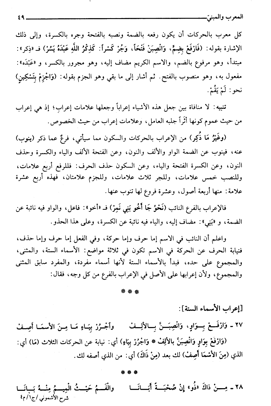 كل معرب بالحركات أن يكون رفعه بالضمة ونصبه بالفتحة وجره بالكسرة، وإلى ذلك الإشارة بقوله: "فَارفَعْ بِضَم، وَانْصِبَنْ فَتْحَا، وَجُرْ كَسْرا كَذِكْرُ اللَّهِ عَبْدَهُ يَسُرْ" فـ"ذكر": مبتدأ، وهو مرفوع بالضم، والاسم الكريم مضاف إليه، وهو مجرور بالكسر، و"عبده": مفعول به، وهو منصوب بالفتح. ثم أشار إلى ما بقي وهو الجزم بقوله: "واجزم بتسكين" نحو: لم يقم.