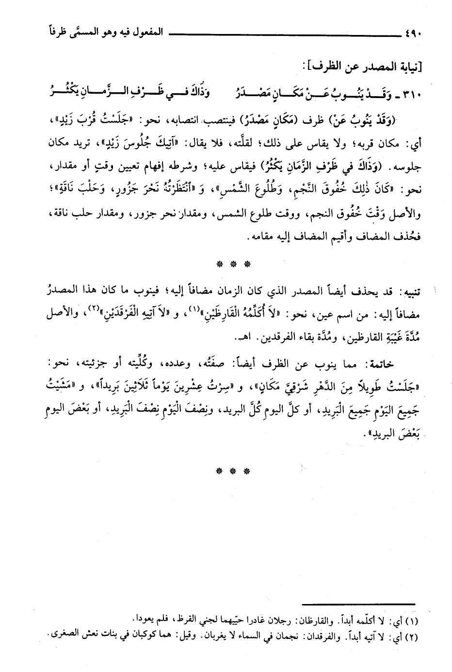 خاتمة: مما ينوب عن الظرف أيضا: صفته، وعدده، وكليته أو جزئيته، نحو: "جلست طويلا من الدهر شرقي مكان"، و"سرت عشرين يوما ثلاثين بريدا"، و"مشيت جميع اليوم جميع البريد، أو كل اليوم كل البريد، ونصف اليوم نصف البريد، أو بعض اليوم بعض البريد".