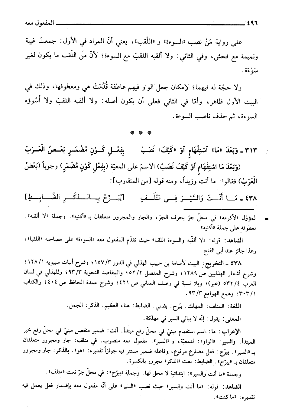 الشاهد: قوله: "ما أنت والسير" حيث نصب "السير" على أنه مفعول معه بإضمار فعل يعمل فيه تقديره: "ما كنت".