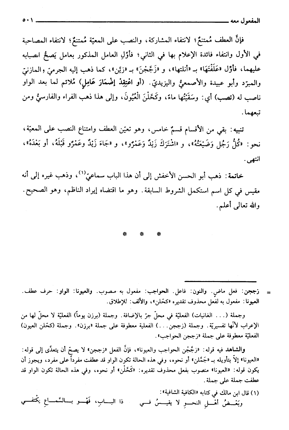 فإن العطف ممتنع؛ لانتفاء المشاركة، والنصب على المعية ممتنع لانتفاء المصاحبة في الأول وانتفاء فائدة الإعلام بها في الثاني؛ فأول العامل المذكور بعامل يصخ انصبابه عليهما، فأول "علفتها" بـ"أنلتها"، و"زججن" بـ"زين"، كما ذهب إليه الجرمي والمازني والمبرد وأبو عبيدة والأصمعي واليزيدي. "أو اعتقد إضمار عامل" ملائم لما بعد الواو ناصب له "تصب" أي: وسقيتها ماء، وكحلن العيون، وإلى هذا ذهب الفراء والفارسي ومن تبعهما.