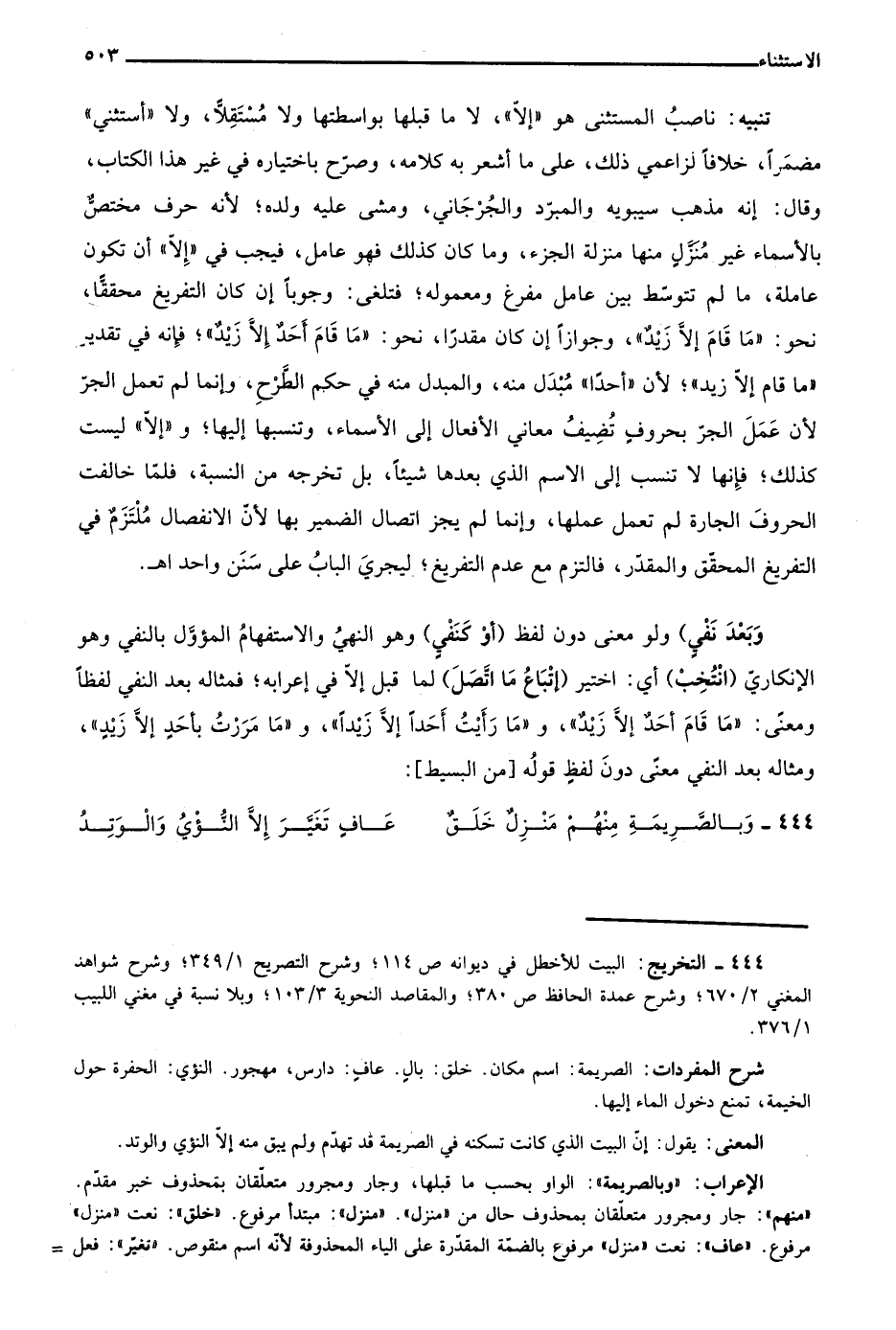 تنبيه: ناصب المستثنى هو "إلا"، لا ما قبلها بواسطتها ولا مستقلا، ولا "استثنى" مضمرا، خلافا لزاعمي ذلك، على ما أشعر به كلامه، وصرح باختياره في غير هذا الكتاب، وقال: إنه مذهب سيبويه والمبرد والجرجاني، ومشى عليه ولده؛ لأنه حرف مختص بالأسماء غير منزل منها منزلة الجزء، وما كان كذلك فهو عامل، فيجب في "إلا" أن تكون عاملة، مالم تتوسط بين عامل مفرغ ومعموله؛ فتلغى: وجوبا إن كان التفريغ محققا، نحو: "ما قام إلا زيد"، وجوازا إن كان مقدرا، نحو: "ما قام أحد إلا زيد"؛ فإنه في تقدير "ما قام إلا زيد"؛ لأن "أحد" مبدل منه، والمبدل منه في حكم الطرح، وإنما لم تعمل الجر لأن عمل الجر بحروف تضيف معاني الأفعال إلى الأسماء، وتنسبها إليها؛ و"إلا" ليست كذلك؛ فإنها لا تنسب إلى الاسم الذي بعدها شيئا، بل تخرجه من النسبة، فلما خالفت الحروف الجارة لم تعمل عملها، وإنما لم يجز اتصال الضمير بها لأن الانفصال ملتزم في التفريغ المحقق والمقدر، فالتزم مع عدم التفريغ؛ ليجري الباب على سنن واحد اهـ.