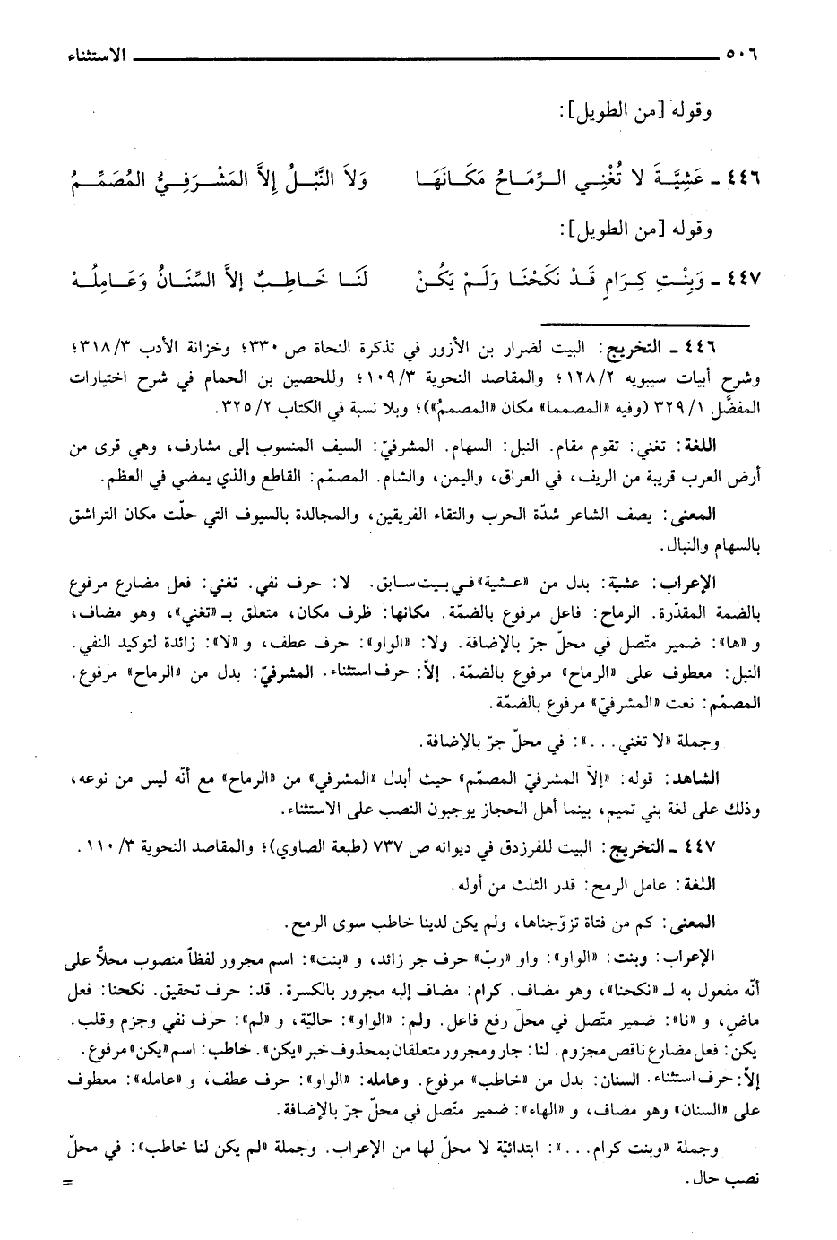 الشاهد: قوله: "إلا المشرفي المصمم" حيث أبدل "المشرفي" من "الرماح" مع أنه ليس من نوعه، وذلك على لغة بني تميم، بينما أهل الحجاز يوجبون النصب على الاستثناء.