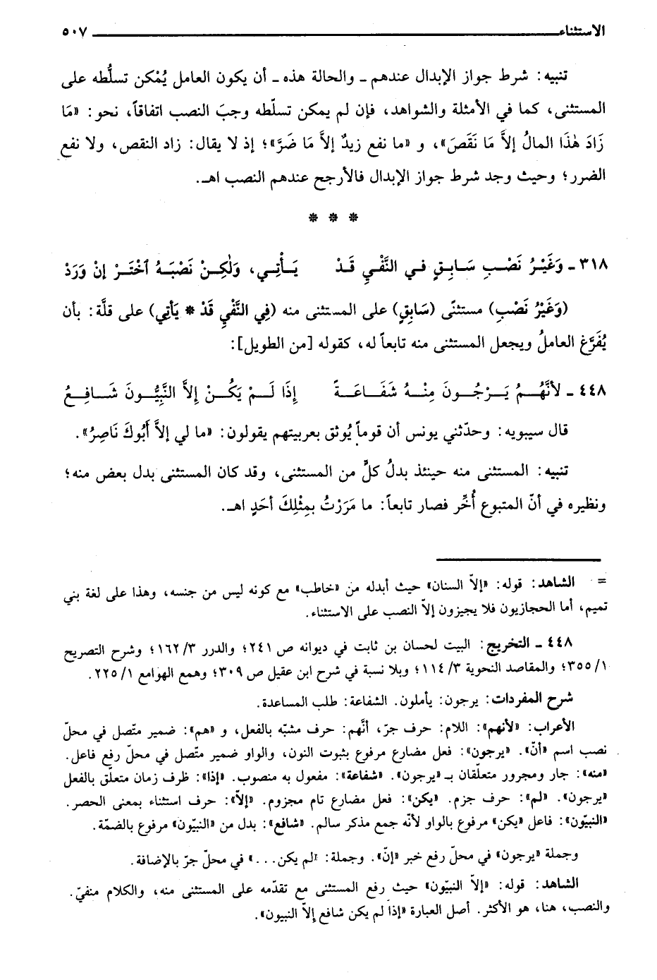 تنبيه: شرط جواز الإبدال عندهم -والحالة هذه- أن يكون العامل يمكن تسلطه على المستثنى، كما في الأمثلة والشواهد، فإن لم يمكن تسلطه وجب النصب اتفاقا، نحو: "ما زاد هذا المال إلا ما نقص"، و"ما نفع زيد إلا ما ضر"؛ إذ لا يقال: زاد النقص، ولا نفع الضرر؛ وحيث وجد شرط جواز الإبدال فالأرجح عندهم النصب, اهـ.