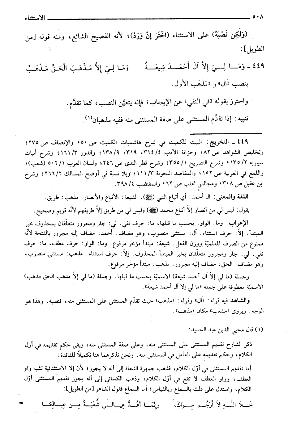 الإعراب: وما: الواو: بحسب ما قبلها، ما: حرف نفي. لي: جار ومجرور متعلقان بمحذوف خبر المبتدأ. إلا: حرف استثناء. آل: مستثنى منصوب، وهو مضاف. أحمد: مضاف إليه مجرور بالفتحة لأنه ممنوع من الصرف للعلمية ووزن الفعل. شيعة: مبتدأ مؤخر مرفوع. وما: الواو: حرف عطف، ما: حرف نفي. لي: جار ومجرور متعلقان بمحذوف خبر المبتدأ. إلا: حرف استثناء. آل: مستثنى منصوب، وهو مضاف. الحق: مضاف إليه مجرور. مذهب: مبتدأ مؤخر مرفوع.