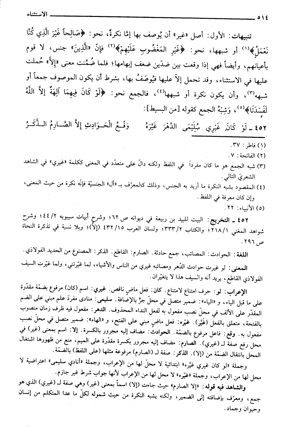 تنبيهات: الأول: أصل "غير" أن يوصف بها إما نكرة، نحو: {صَالِحًا غَيْرَ الَّذِي كُنَّا نَعْمَلُ} 1 أو شبهها، نحو: {غَيْرِ الْمَغْضُوبِ عَلَيْهِمْ} 2 فإن "الذين" جنس، لا قوم بأعيانهم، وأيضا فهي إذا وقعت بين ضدين ضعف إبهامها؛ فلما ضمنت معنى "إلا" حملت عليها في الاستثناء، وقد تحمل إلا عليها فيوصف بها، بشرط أن يكون الموصوف جمعا أو شبهه3، وأن يكون نكرة أو شبهها4، فالجمع نحو: {لَوْ كَانَ فِيهِمَا آَلِهَةٌ إِلَّا اللَّهُ لَفَسَدَتَا} 5، وشبه الجمع كقوله "من البسيط":