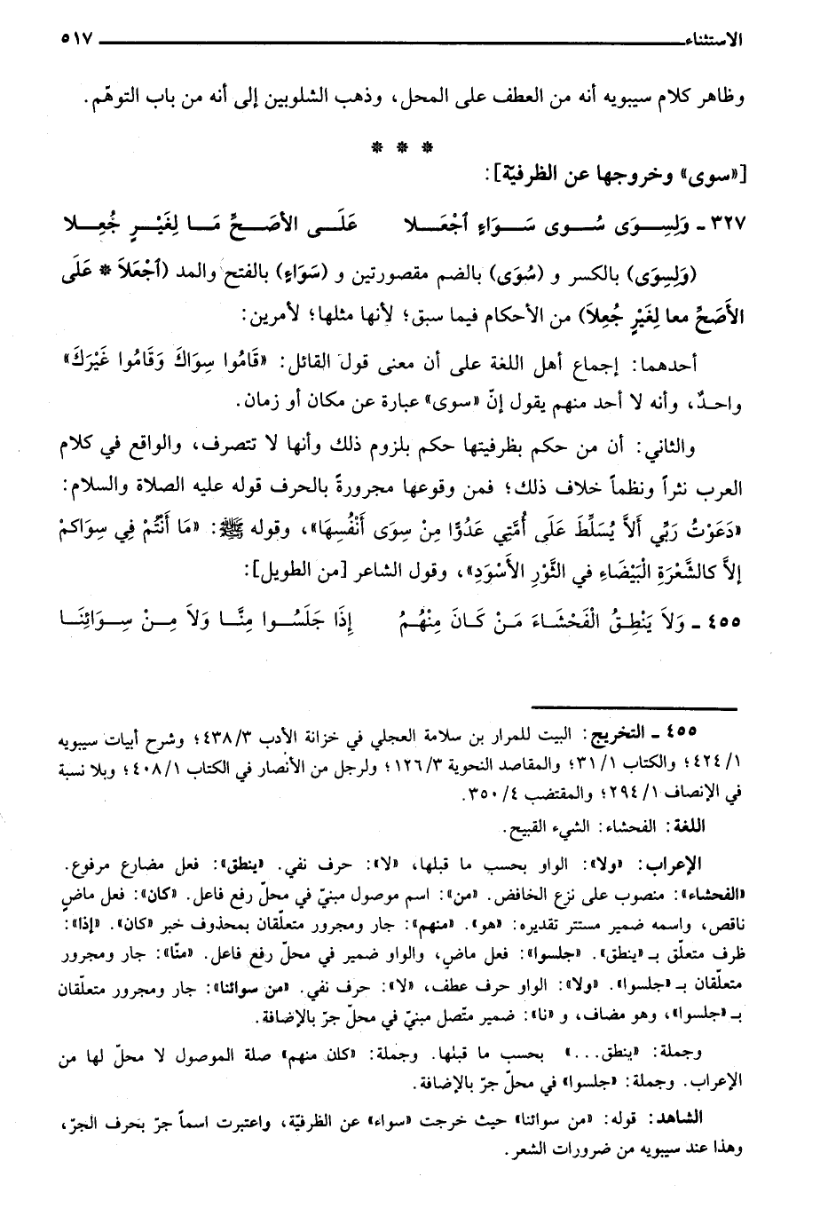 والثاني: أن من حكم بظرفيتها حكم بلزوم ذلك وأنها لا تتصرف، والواقع في كلام العرب نثرا ونظما خلاف ذلك؛ فمن وقوعها مجرورة بالحرف قوله عليه الصلاة والسلام: "دعوت ربي ألا يسلط على أمتي عدوا من سوى أنفسها"، وقوله صلى الله عليه وسلم: "ما أنتم في سواكم إلا كالشعرة البيضاء في الثور الأسود"، وقول الشاعر "من الطويل":