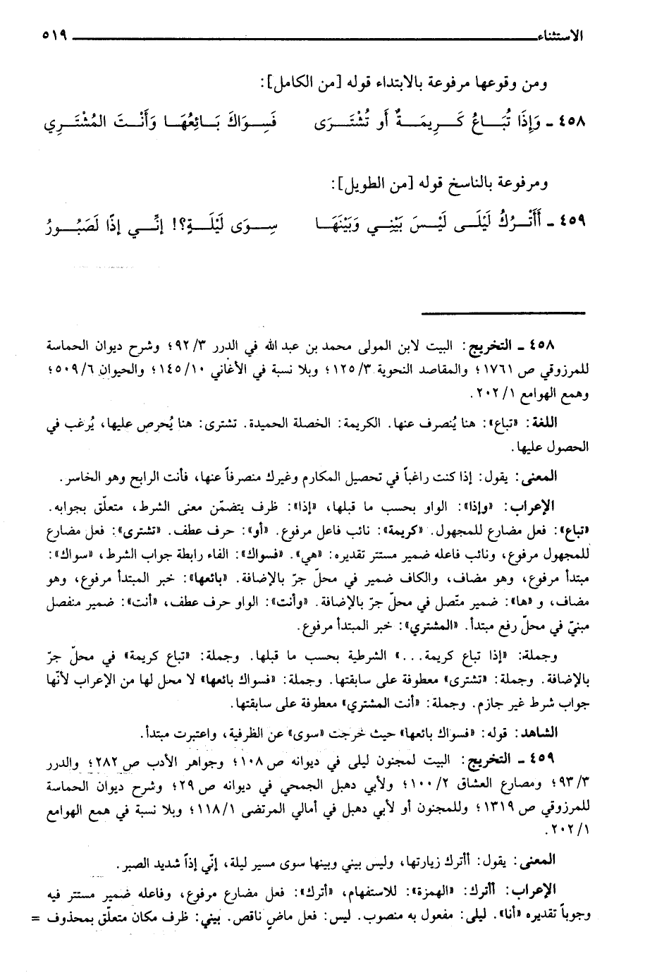 458- التخريج: البيت لابن المولى محمد بن عبد الله في الدرر 3/ 92؛ وشرح ديوان الحماسة للمرزوقي ص1761؛ والمقاصد النحوية 3/ 125؛ وبلا نسبة في الأغاني 10/ 145؛ والحيوان 6/ 509؛ وهمع الهوامع 1/ 202.